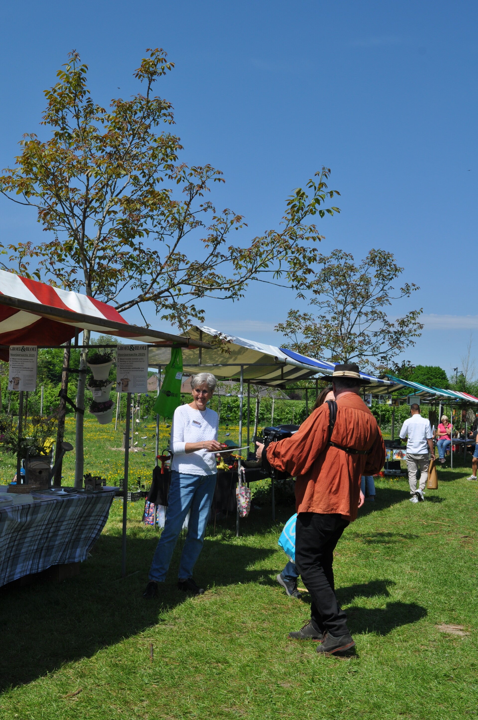 Volwassenen wandelen langs de kramen, voeren gesprekken met kwekers of zitten ontspannen op het terras.
